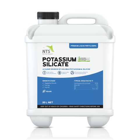 Do not spray during flowering. Not compatible with acidic inputs. Potassium Silicate is very alkaline and recommended rates should never be exceeded to avoid possible plant damage. As silicon is not readily transported within the plant more than one application will be required per season to ensure the full benefits.